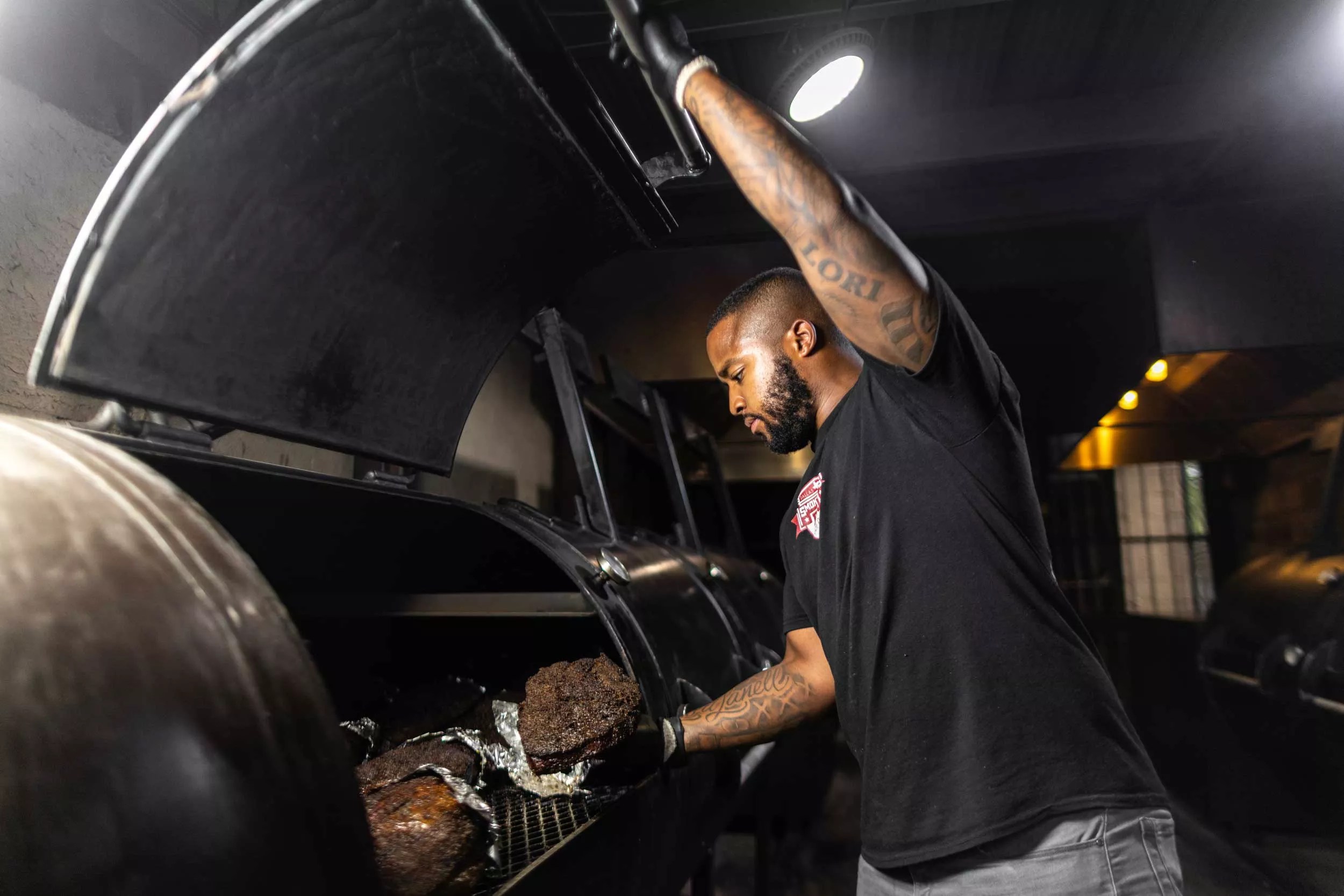Kris Manning checks his brisket in the smoker at Smokey Joe’s BBQ.
