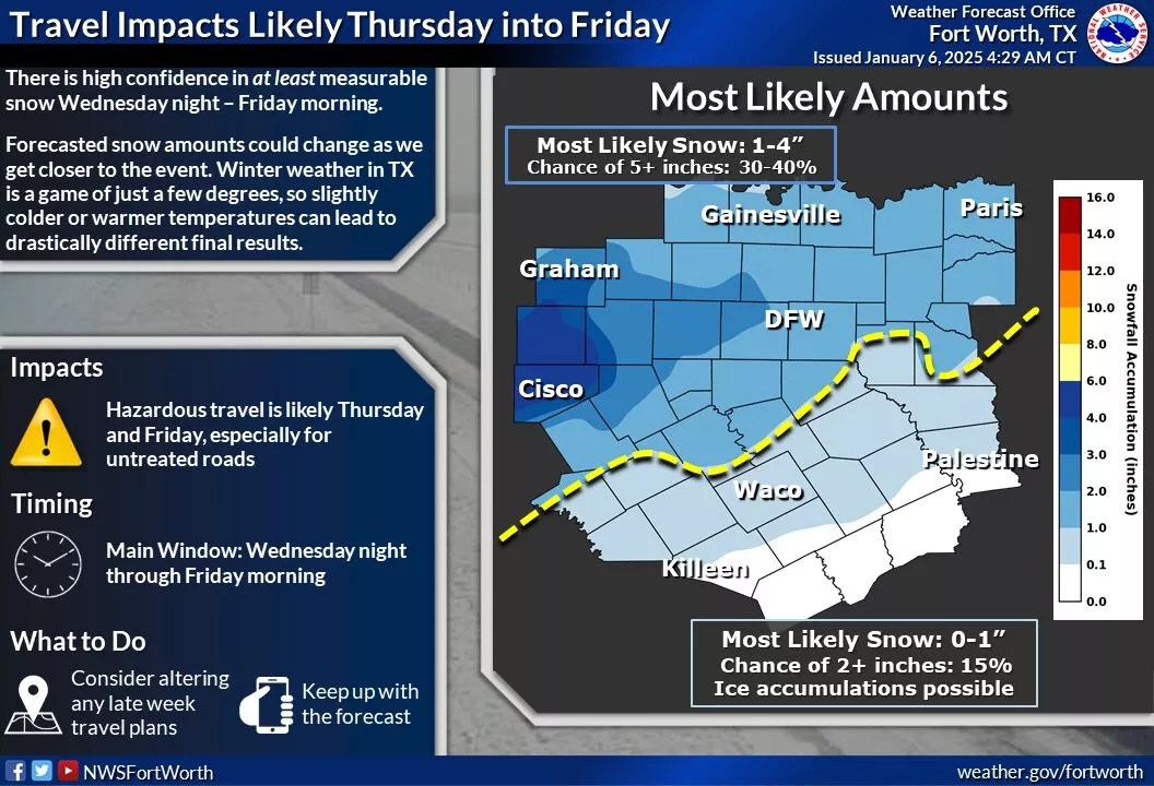 “There is high confidence in at least measurable snow Wednesday night into Friday,” the NWS for Fort Worth-Dallas noted on its homepage. “A rain-snow mix is expected, so exact amounts are still uncertain. If temperatures are a few degrees warmer or cooler than currently forecast, final snow accumulations may be lower or higher. Hazardous travel is likely Thursday and Friday, especially on untreated roads.”