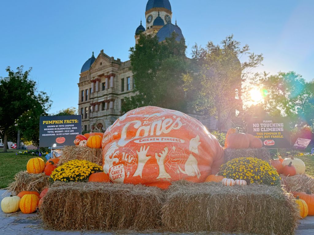 For some reason, Raising Canes commissioned a nearly 2,000-pound pumpkin to be displayed on the Downtown Denton Square. The gourd is intricately carved with Halloween figures like witches and skeletons, was grown by a man in Iowa, and measures 16 by 9 feet around. We don’t know why it’s there, but it’s pretty funny to look at.