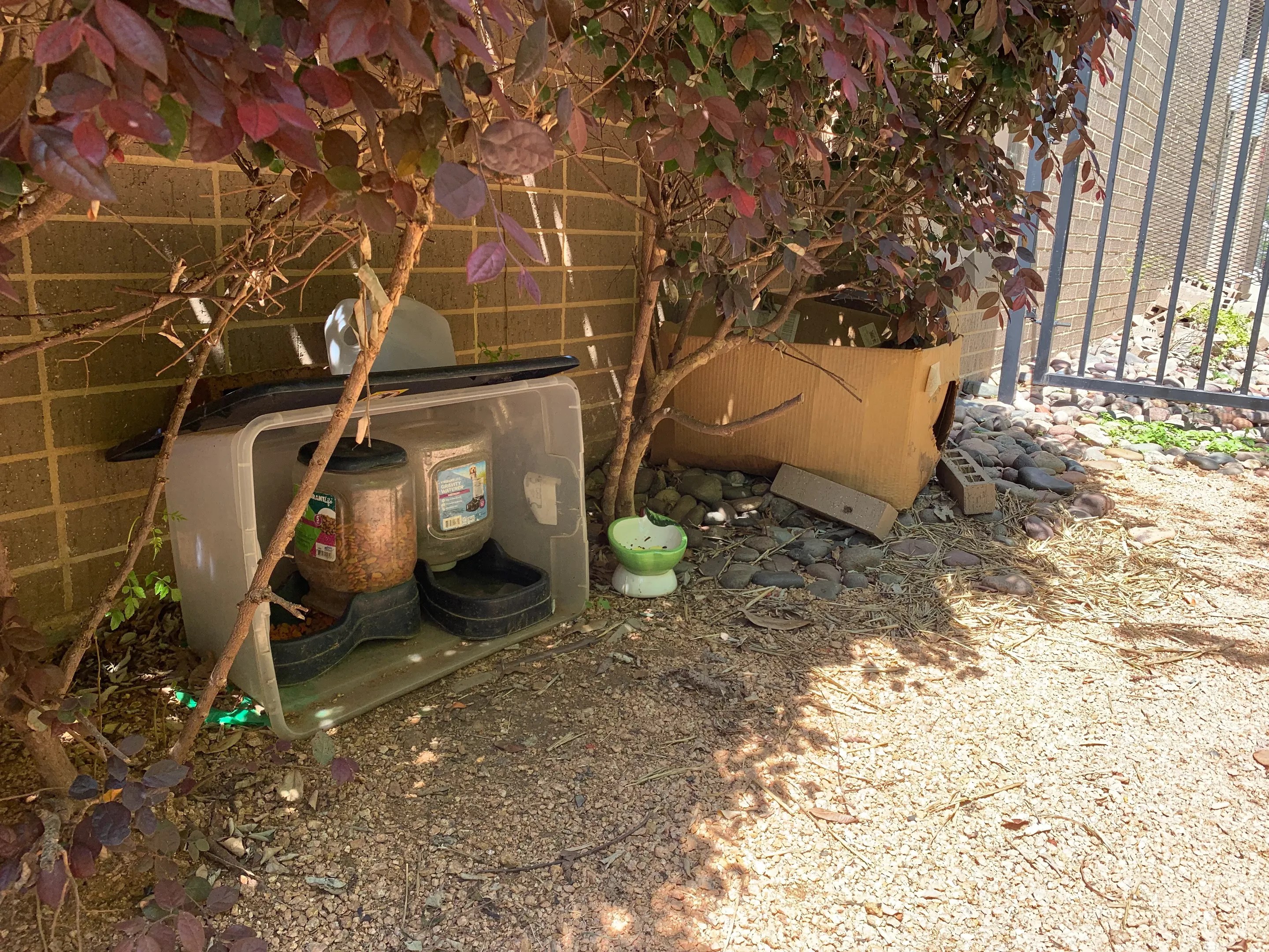 Food and shelter for feral cats can be found next to an apartment complex on Melba Street.