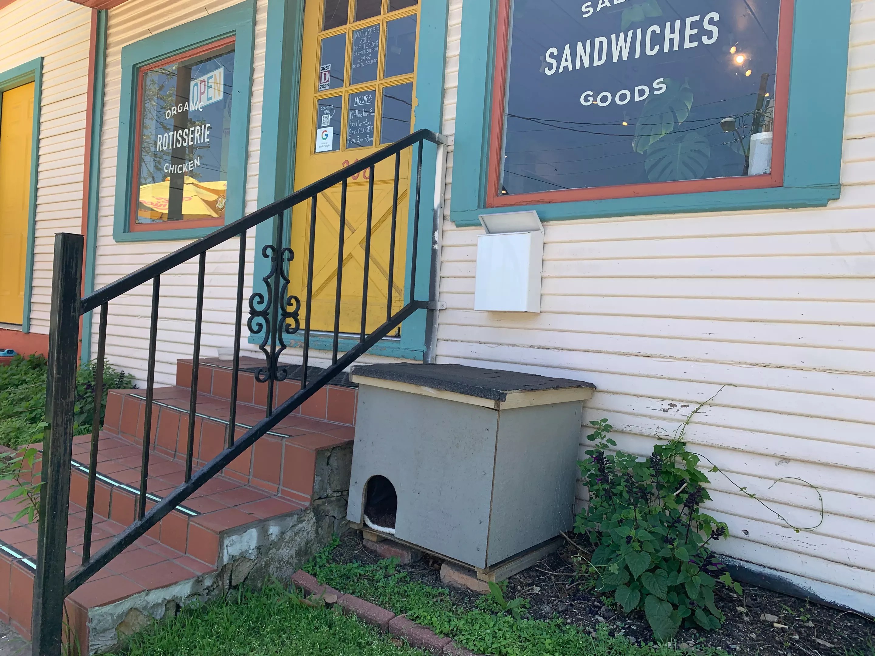 A cat house sits outside La Bodega in Oak Cliff. The house was made for a specific outdoor cat named Leftovers who is the mascot of Bodega and Taco Y Vino.
