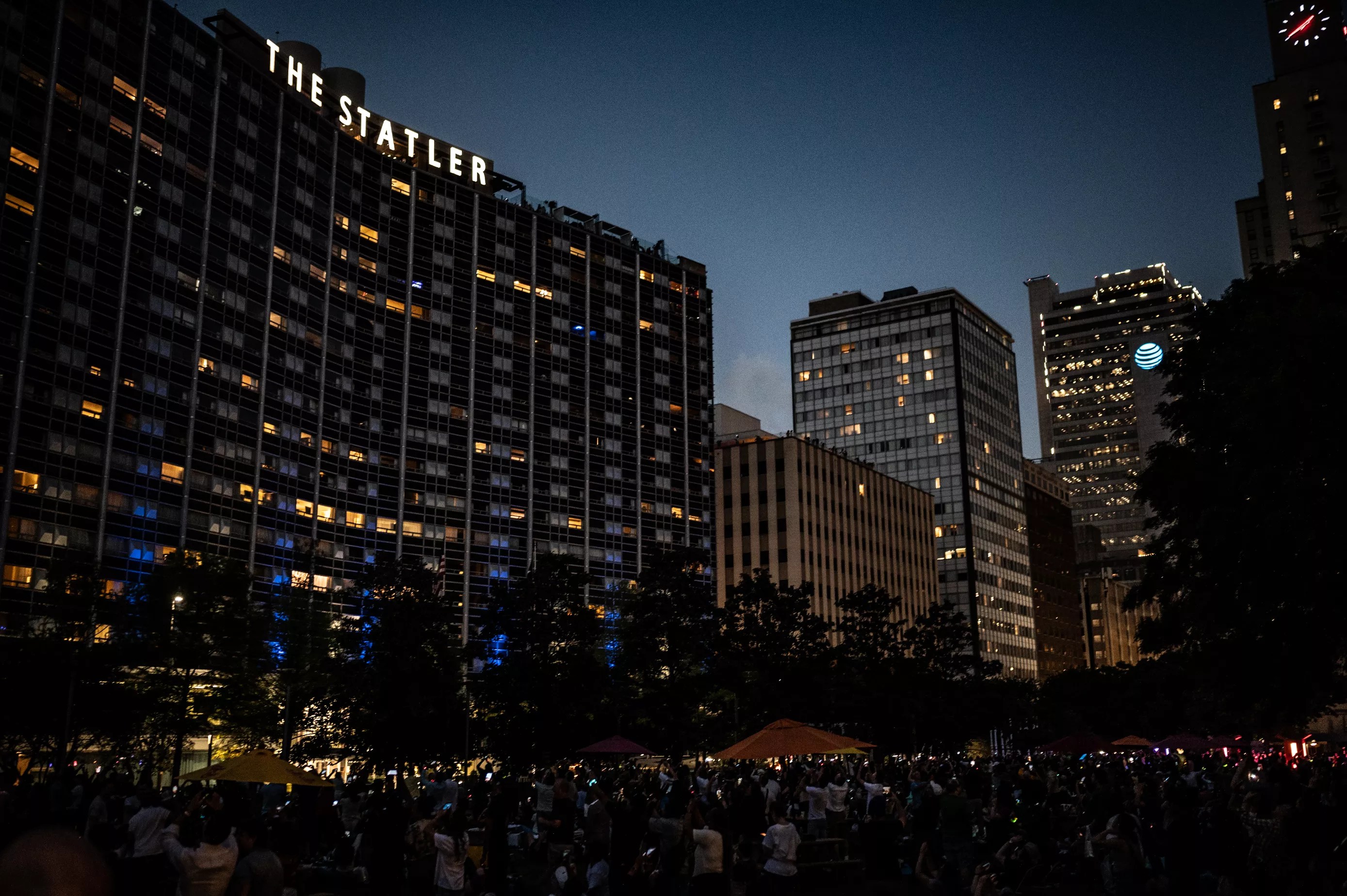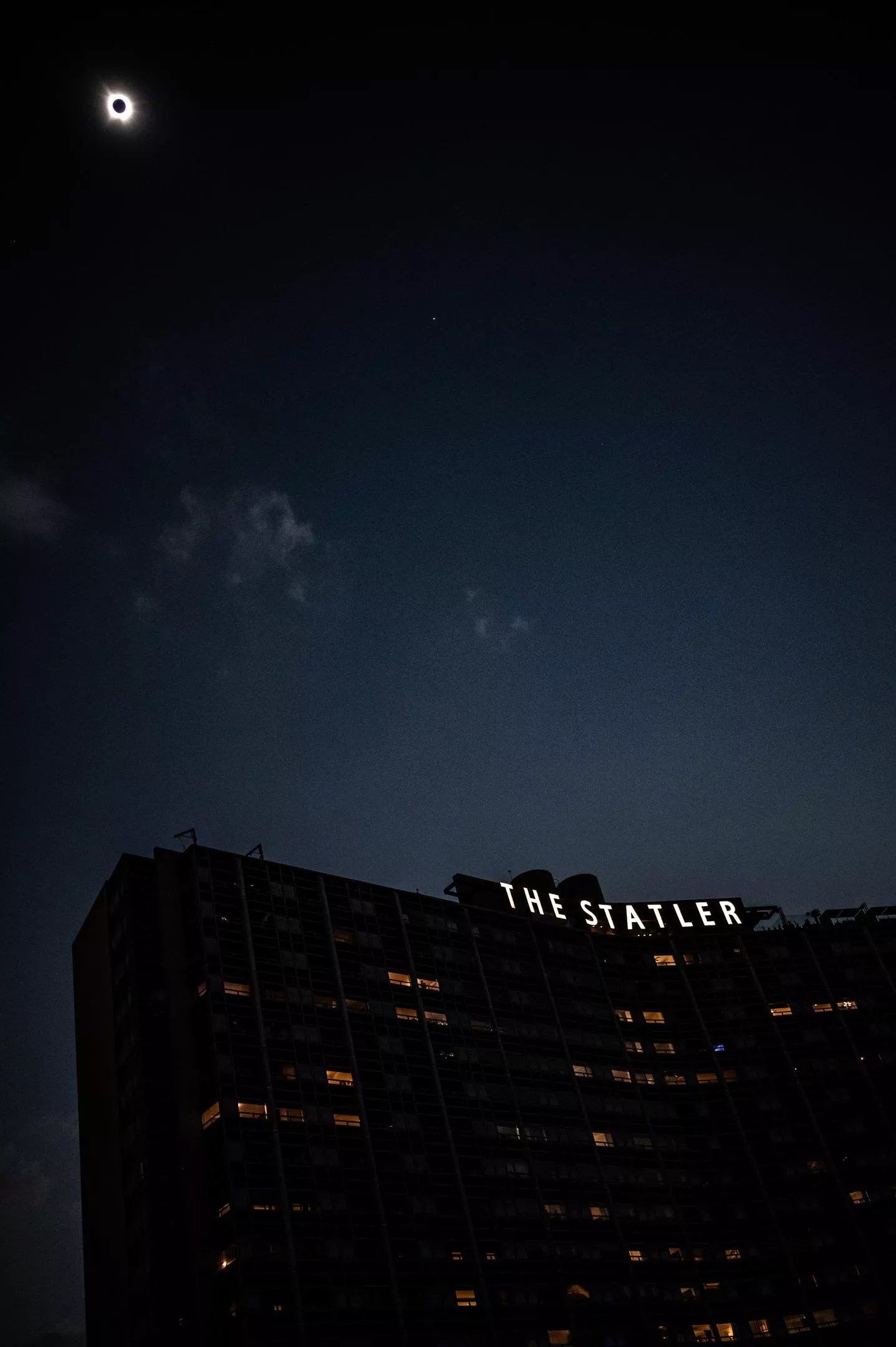 A view of the eclipse of the Statler Hotel during Downtown Dallas Inc.’s party at Main Street Garden, April 8, 2024.