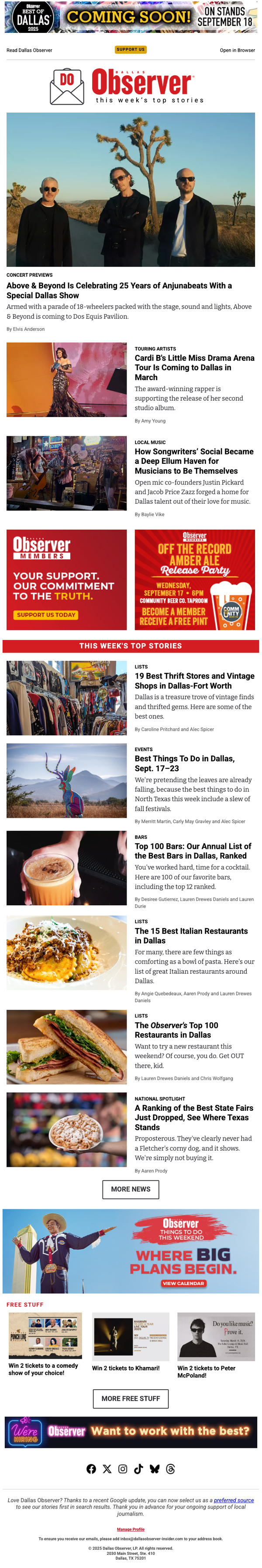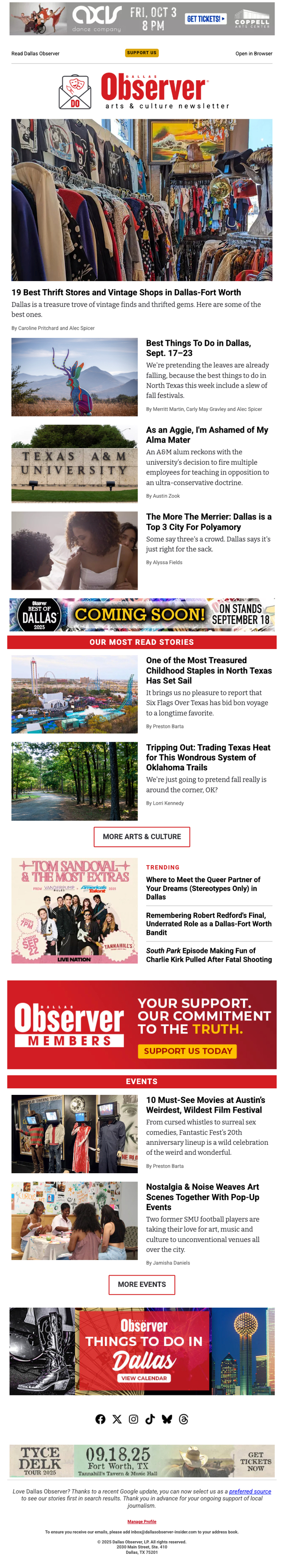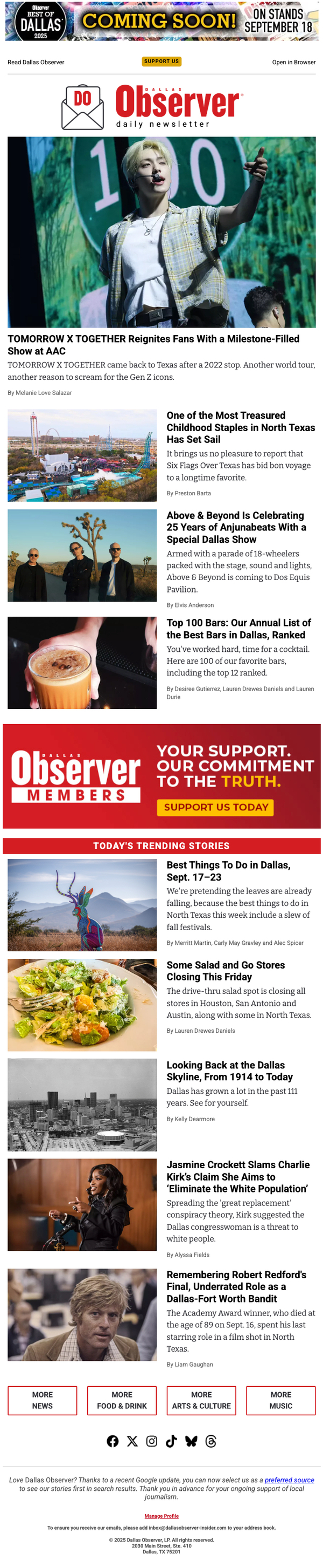 Stay informed with our daily digest of the most popular news, music, food and arts stories in Dallas. Delivered every morning Monday through Friday.