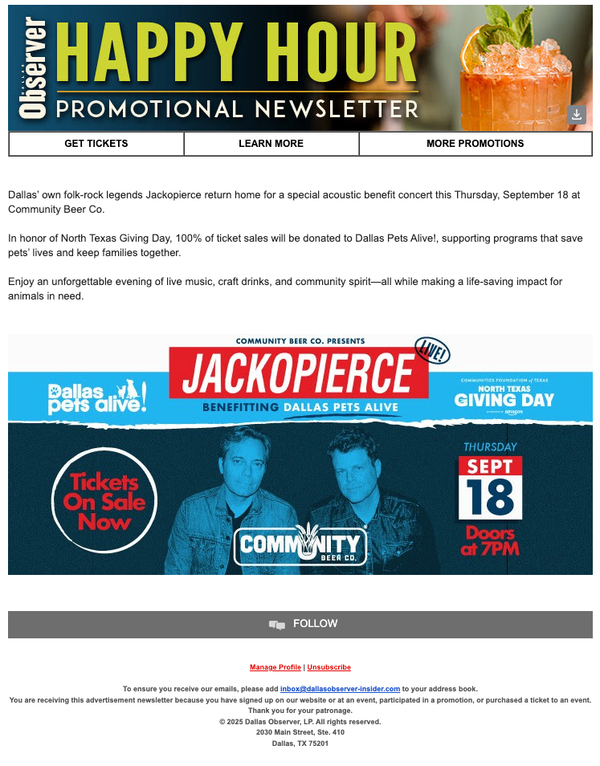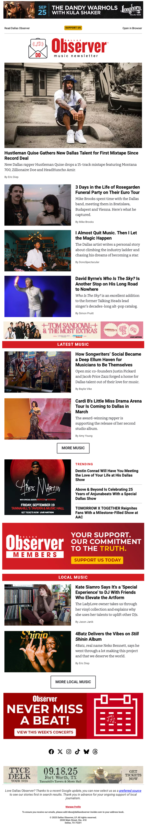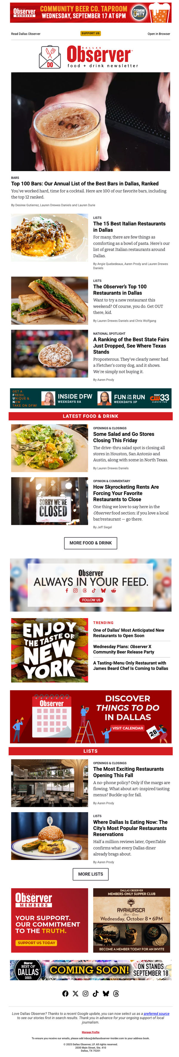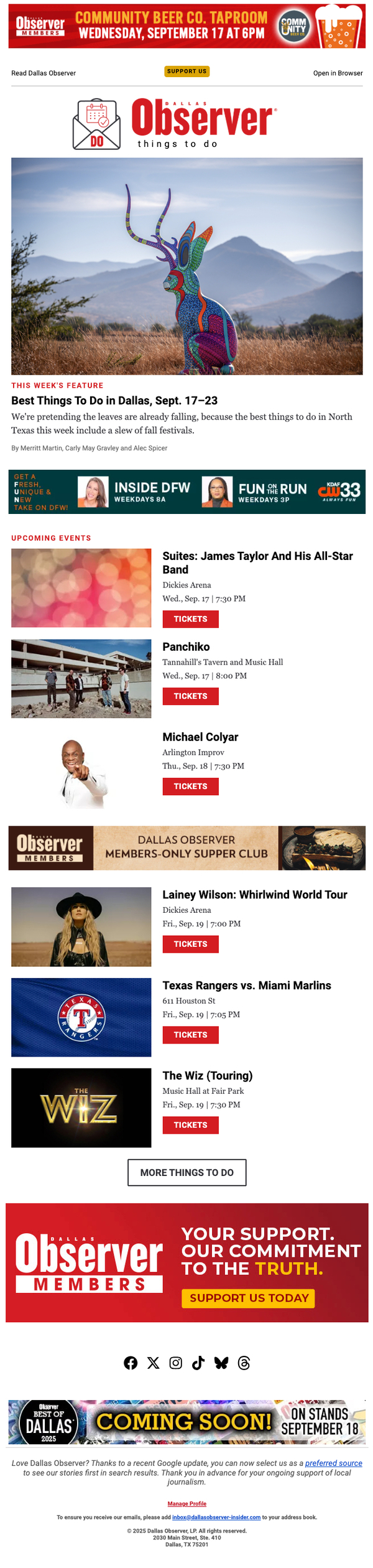 Stay informed with our daily digest of the most popular news, music, food and arts stories in Dallas. Delivered every morning Monday through Friday.