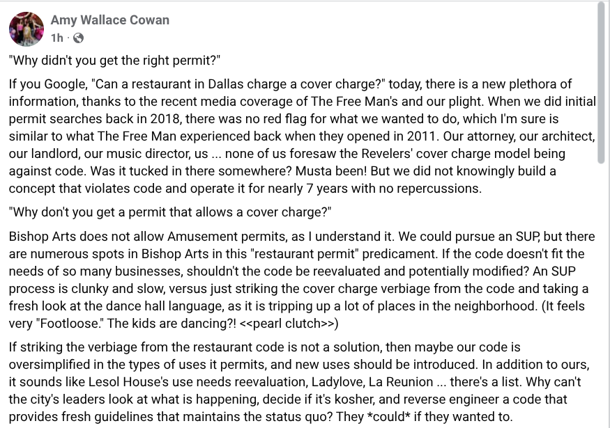 Amy Wallace Cowan, also a co-owner of Revelers Hall, thanked everyone who reached out about the establishment’s ability to have live music. She wrote on Facebook and Instagram, “Let’s rewrite the code in favor of our artists, Dallas.”