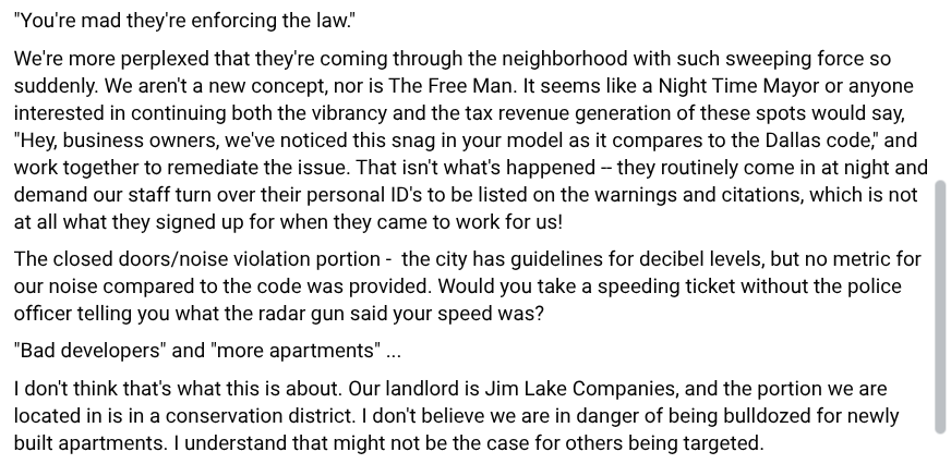 “The city of Dallas’ Nightime Task Force suddenly came in over the past few weeks and have been extremely heavy handed out of nowhere. We presumed they existed to help grow and support nightime [sic] business, but immediately told us to remove our Music Fee…which is how we pay the bands and have done so for over half a decade,” he wrote.